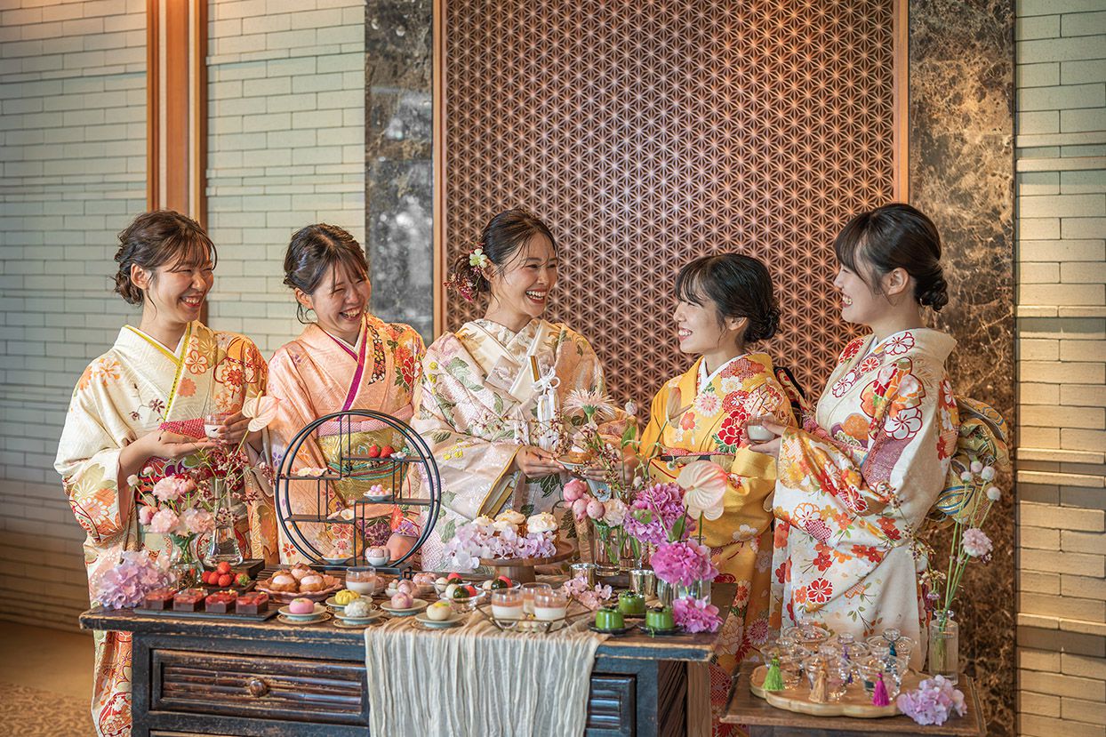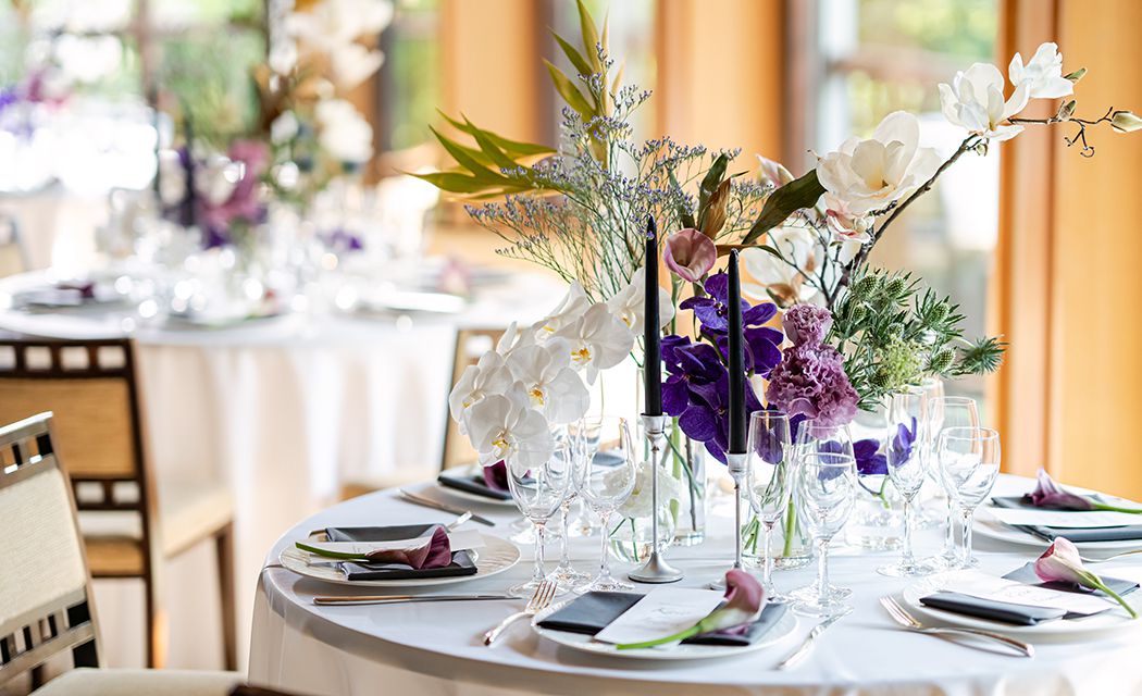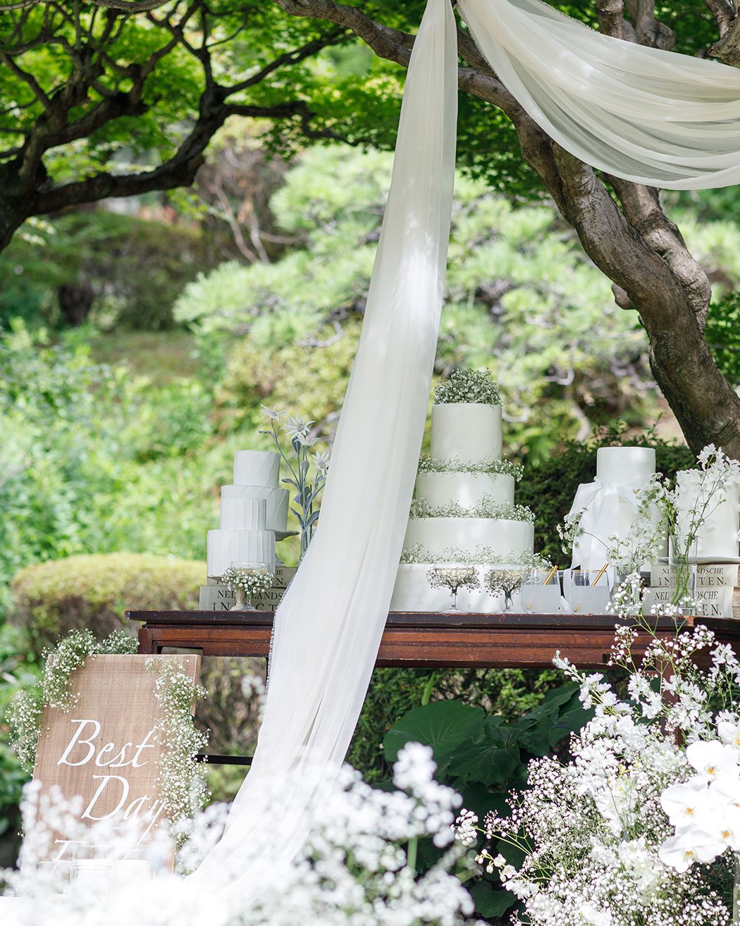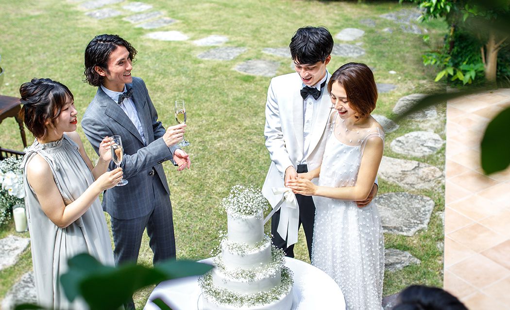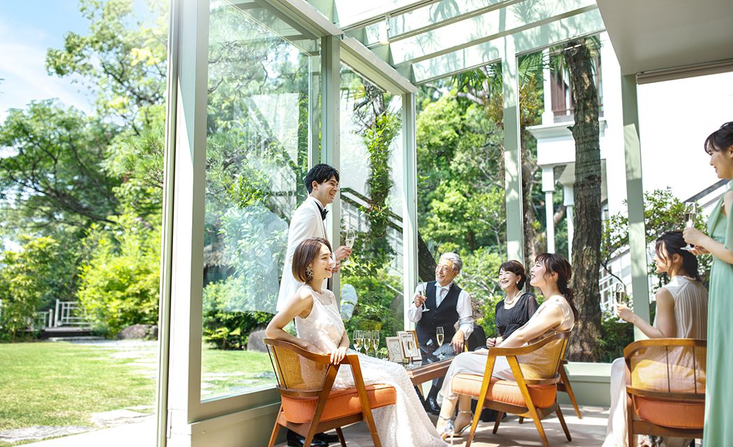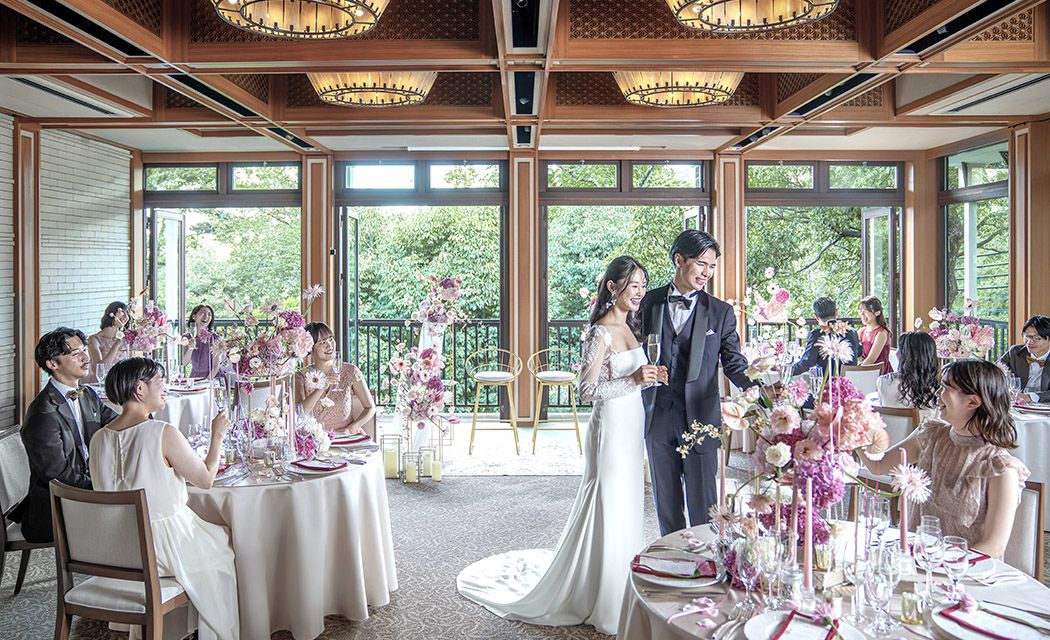 おふたりのご自宅へゲストをお招きするような、アットホームなウェディングシーンを叶える「テラスルーム」。緑の庭園に囲まれたプライベートテラスで。ケーキカットやデザートビュッフェを楽しむのも素敵です。ゆったりとした空気が流れるバンケットはもちろん、専用のセカンドルームでのウェルカムパーティなど。自由な発想で演出していただけます。