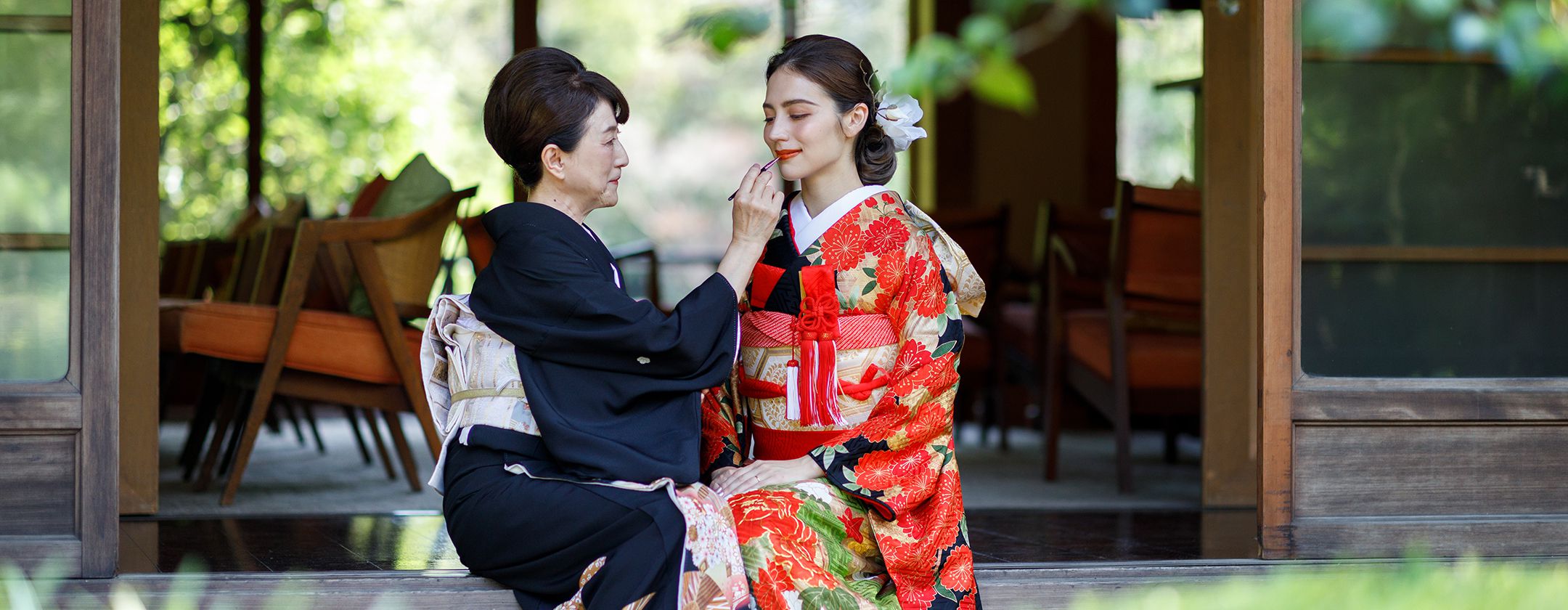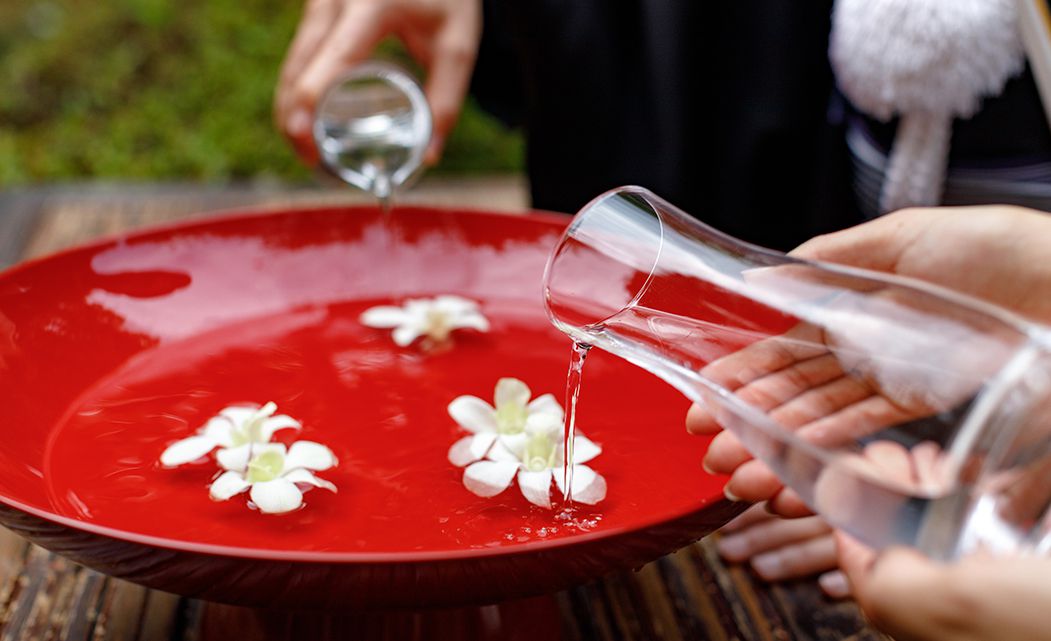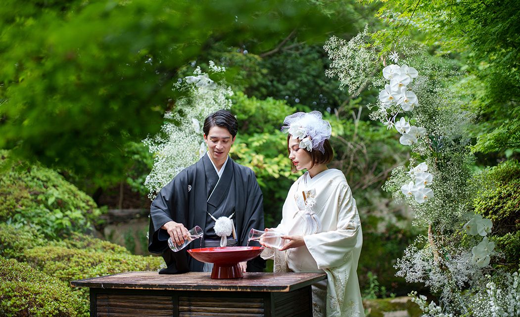 和装の挙式といえどもスタイルは様々。蘇州園では「弓弦羽神社」や「芦屋神社」といったこの土地にゆかりのある神社をご案内が可能です。 また和装でも肩ひじを張らずに過ごせる「和装人前式」も 宗教色を感じない蘇州園のチャペルならでは。